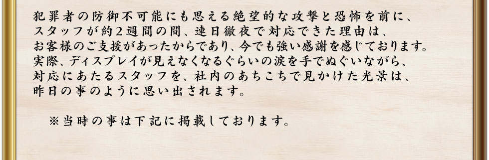 犯罪者の防御不可能にも思える絶望的な攻撃と恐怖を前に、スタッフが約2週間の間、連日徹夜で対応できた理由は、お客様のご支援があったからであり、今でも強い感謝を感じております。実際、ディスプレイが見えなくなるぐらいの涙を手でぬぐいながら、対応にあたるスタッフを、社内のあちこちで見かけた光景は、昨日の事のように思い出されます。※当時の事は下記に掲載しております。https://www.maru-jan.com/fukkyu.html